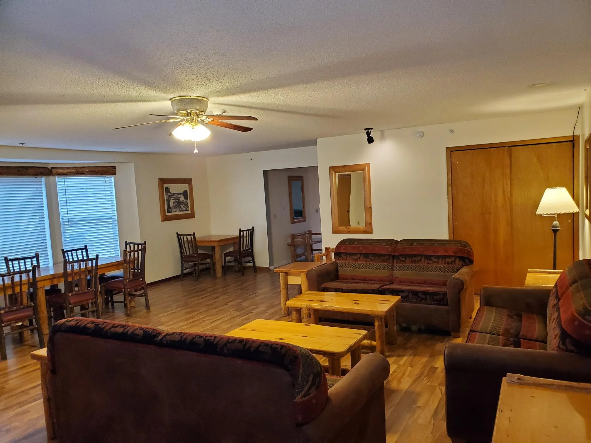 This is a large 4,500 sq ft lodge including an apartment with three bedrooms between dorms connecting on either side. The apartment has three bedrooms (one with a queen bed and two each with double beds). The apartment has a very spacious meeting area with four sofas and multiple seating areas for 40+. Each connecting dorm area has a spacious meeting area and five bedrooms, each bedroom has two bunkbeds to accommodate 20 people.